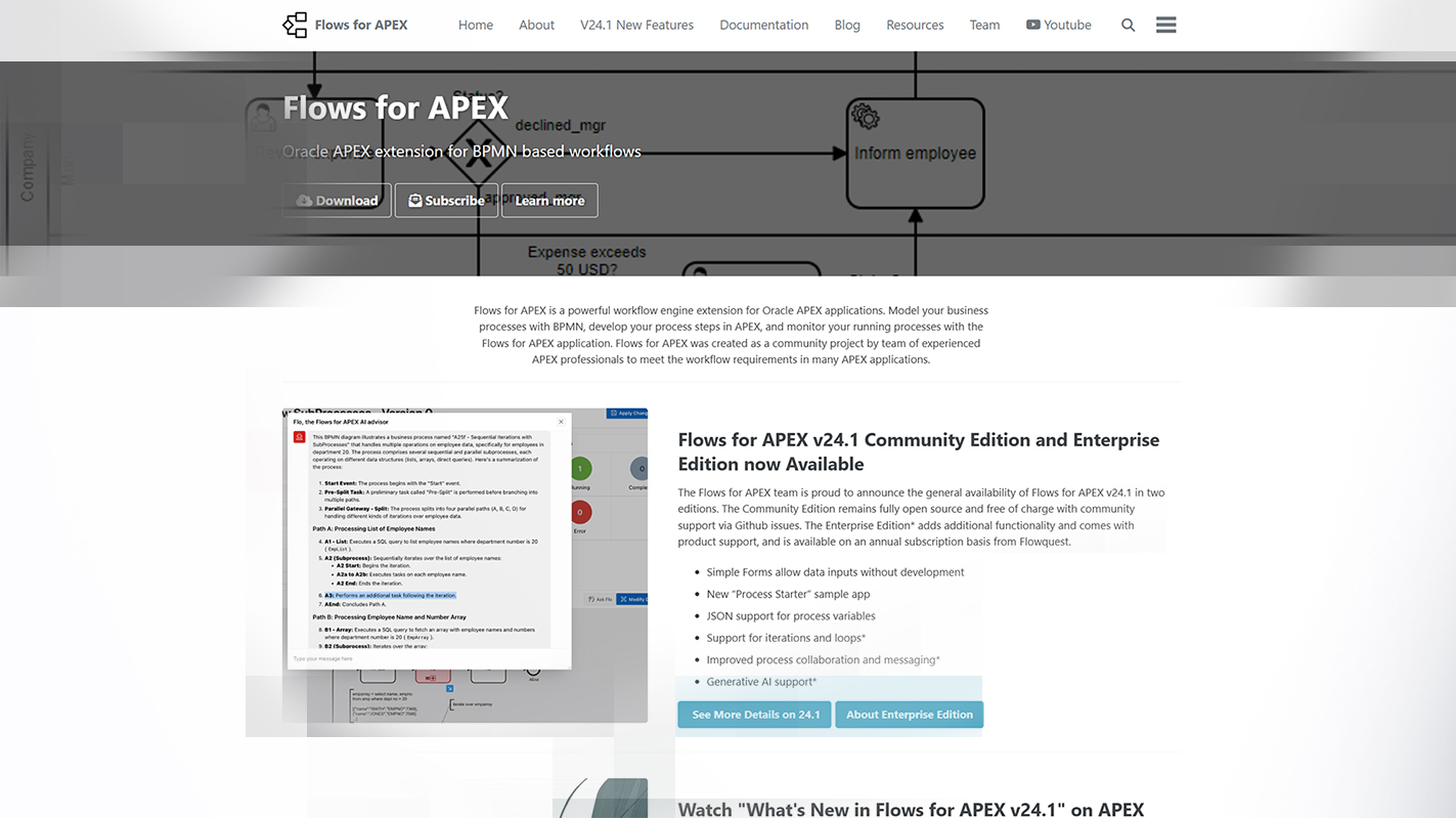 Mehr Informationen sowie eine komplette Dokumentation finden Sie auf der Flows for APEX Webseite.
